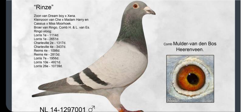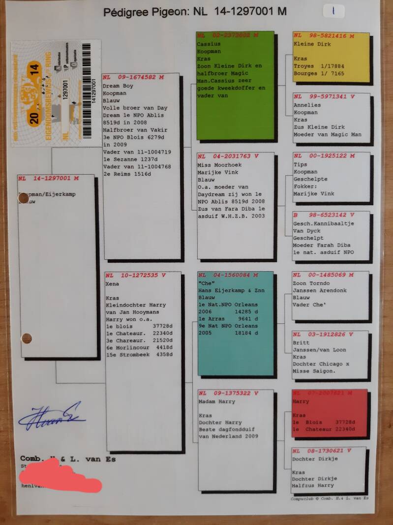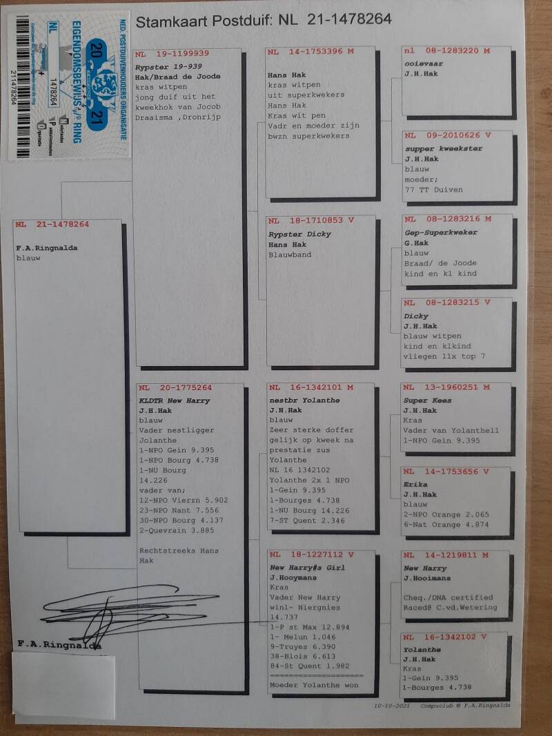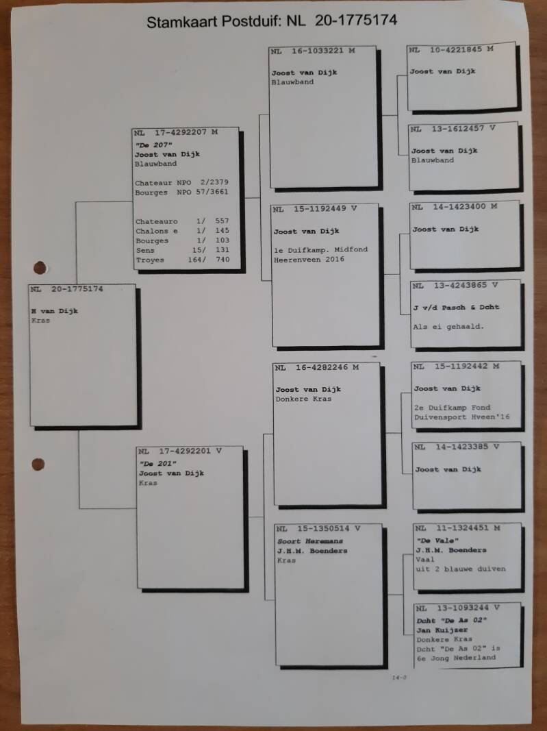 Hieronder staat de stamboom van de 20-174zoon van "DE 207" van Joost van Dijk. Deze doffer vloog 3 eersten in 2018 in de vereniging op de ééndaagse fond . Wat ook resulteerde in een 2e npo Bourges tegen 2379d en 57e npo Chateauroux tegen 3661d.