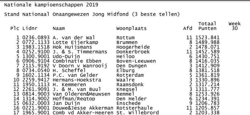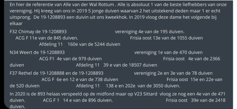 Eerste referentie is Ale van der Wal. Hij werd in 2019 onaangewezen nationaal kampioen midfond jonge duiven!!!!! Waarvan de drie beste vluchten golden.